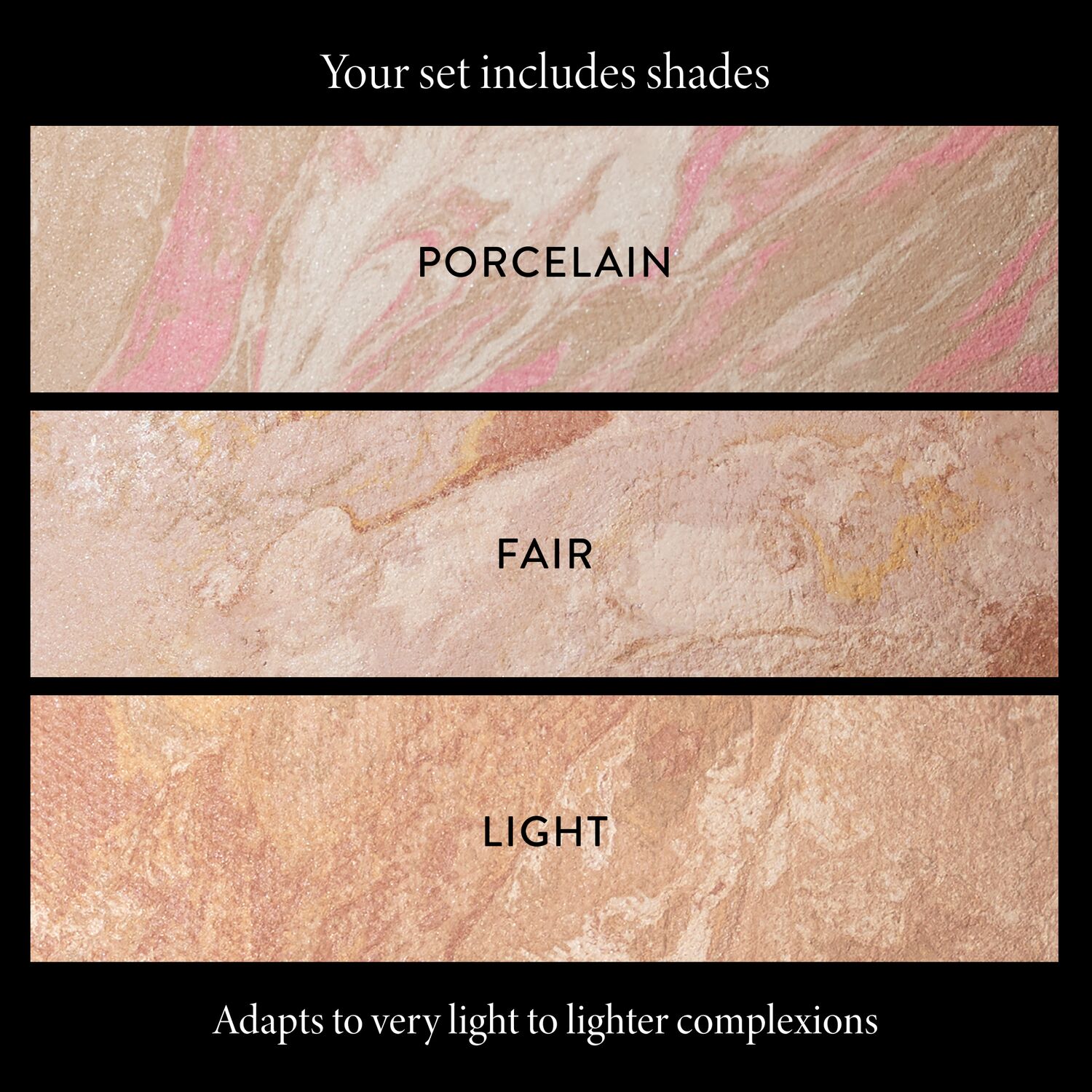 The Fair set contains Porcelain/Fair/Light and is a great choice for those with the lightest skin tones: Very light, fair, pale complexions.