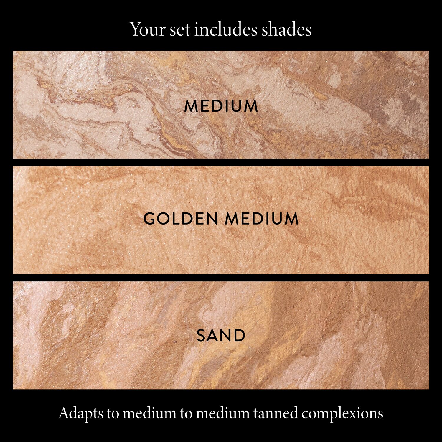 The Medium set contains Medium/Golden Medium/San and is a great option for those with medium, softer tan or olive-toned complexion.