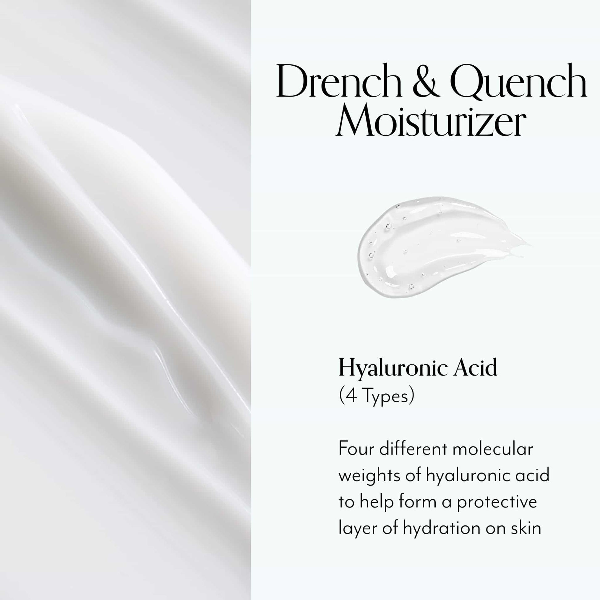 Drench & Quench Moisturizer: AQUA / WATER / EAU, CYCLOPENTASILOXANE, GLYCERIN, BUTYLENE GLYCOL, DIMETHICONE, HYDROGENATED POLYISOBUTENE, SODIUM ACETYLATED HYALURONATE, SODIUM HYALURONATE, SODIUM HYALURONATE CROSSPOLYMER, HYALURONIC ACID, ETHYLHEXYLGLYCERIN, DIMETHICONE/PEG-10/15 CROSSPOLYMER, SODIUM CHLORIDE, PHENOXYETHANOL, BENZYL ALCOHOL, SODIUM CITRATE, DIMETHICONE/VINYL DIMETHICONE CROSSPOLYMER, CHAMOMILLA RECUTITA (MATRICARIA) FLOWER EXTRACT, PASSIFLORA INCARNATA SEED OIL, POTASSIUM SORBATE, GUAR HYDROXYPROPYLTRIMONIUM CHLORIDE, POLYSORBATE 20, DIPROPYLENE GLYCOL, TETRAHEXYLDECYL ASCORBATE, TOCOPHERYL ACETATE, SILYBUM MARIANUM SEED OIL, CAPRYLIC/CAPRIC TRIGLYCERIDE, PORPHYRA UMBILICALIS EXTRACT, TOCOPHEROL, COMMIPHORA MUKUL RESIN EXTRACT, SACCHARINA LONGICRURIS EXTRACT, ROSA MULTIFLORA FRUIT EXTRACT, SODIUM BENZOATE, LINALOOL, ALPHA-ISOMETHYL IONONE, LIMONENE, PARFUM / FRAGRANCE.