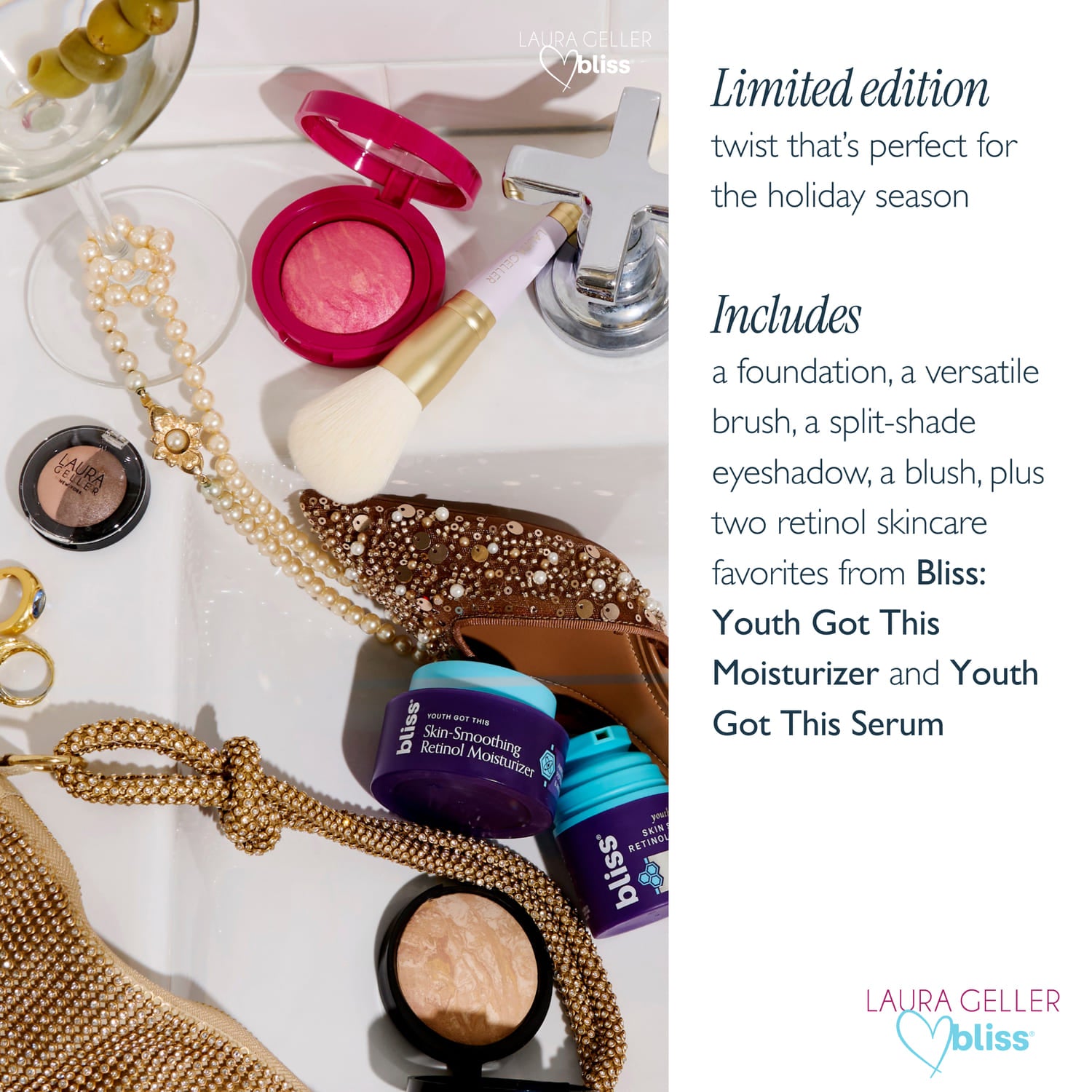 - Includes Bliss' Youth Got This Retinol Serum and Moisturizer to target the look of fine lines, our iconic Baked Balance-n-Brighten Color Correcting Foundation for natural coverage that never cakes or creases, a limited-edition Baked Blush-n-Brighten, a versatile Baked Eyeshadow Duo and two limited-edition makeup brushes